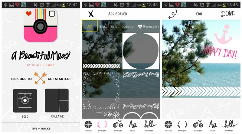 Ces deux applications, ce sont de simples caprices, surtout que maintenant, les fonctionnalités qu'elles proposent sont présentes gratuitement dans les deux précédentes... J'avais acheté Piclab pour la possibilité d'ajouter certains cadres comme le rond, le cœur... et de plus, les polices proposées sont vraiment jolies pour certaines. Mais avec les améliorations de Line Camera, l'appli est un peu devenue inutile... Pour A beautiful mess, c'est pareil, j'adorais les bordures, "doodles" et textes à ajouter aux images.