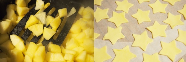 A l'aide d'un emporte pièce, réalisez des formes dans la pâte feuilletée. J'ai opté pour des étoiles, pour le côté festif, mais faites avec ce que vous avez sous la main ! Astuce, si vous n'avez pas d'emporte-pièce, vous pouvez en fabriquer un en coupant une canette en métal vide.
